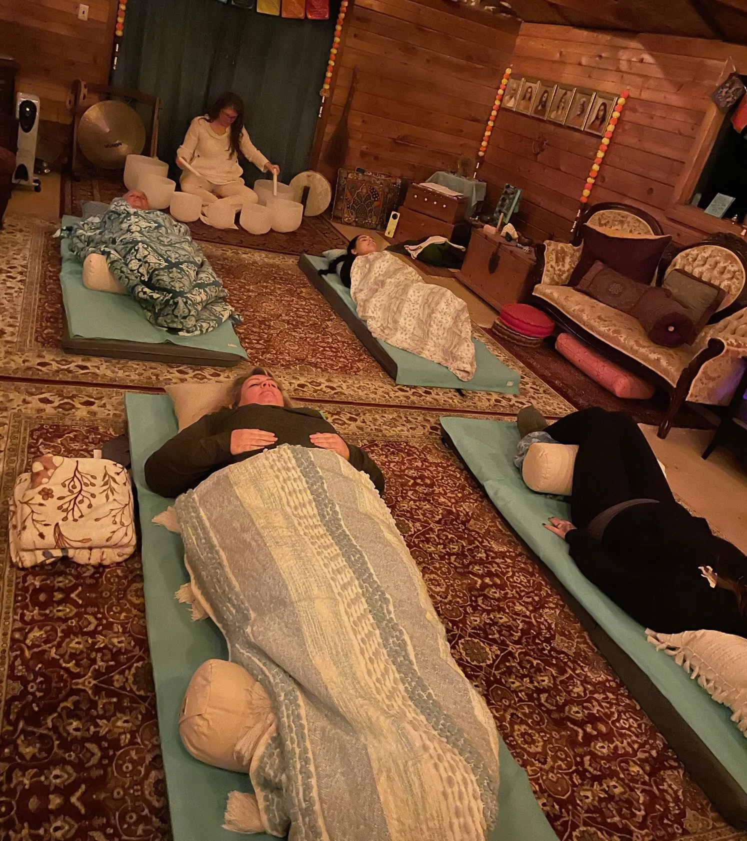 We provide a comfortable mattress, pillow and blanket along with a bolster for your knees to help you relax and deepen your experience.